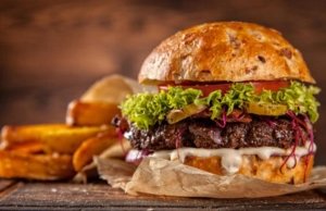 Hamburguesita (125 Gr) con queso, jamón y papa a la francesa.